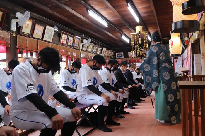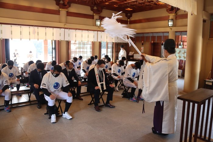当部は1月6日に福山八幡宮(福山)、1月10日に厄神社(倉敷)にて必勝祈願を行いました。 部長をはじめ、選手、スタッフ30名で神事に臨み今シーズンの必勝を祈願しました。 新たに新人選手7名を迎え入れ、更なるチーム力強化を図り、昨年以上の成績を残せるように励んでおります。 今シーズンにおきましても、皆様の熱いご声援をどうぞ宜しくお願い致します。
