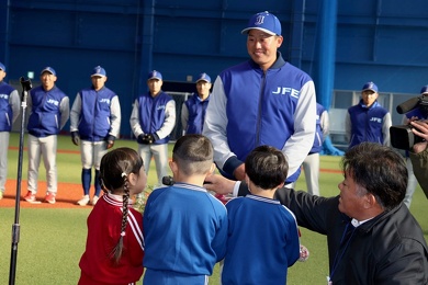 佐伯市・田中市長が球場にお越しくださり、歓迎のお言葉、さらには特産品(たくさんのイチゴ)まで頂きました☆彡