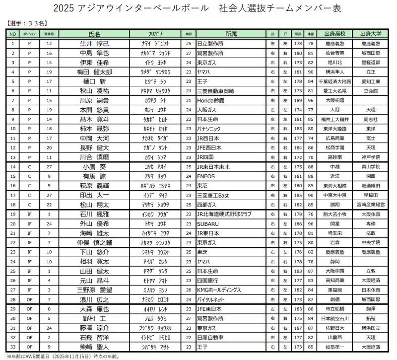 弊部所属の大森廉也 が、台湾プロ野球連盟(CPBL)主催の「2025アジアウインターベースボールリーグ(AWB)」のJABA選抜メンバーに選出されました!