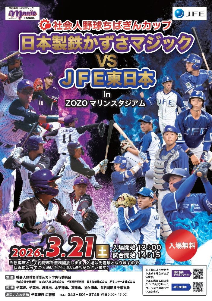 3月21日(土)にZOZOマリンスタジアムにて「社会人野球ちばぎんカップ JFE東日本vs日本製鉄かずさマジック」が開催されることとなりました。