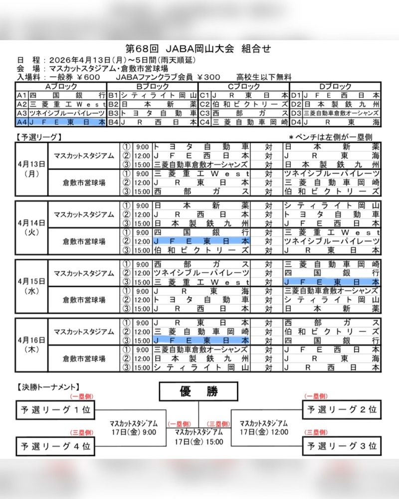 JABA岡山大会の組み合わせが決定いたしました!