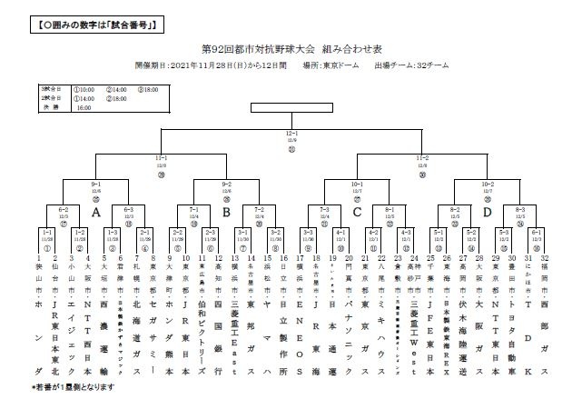 第92回都市対抗野球大会の組合せを掲載しました。 JFE東日本の初戦は、12/2(木)10:00~vs日本製鉄東海REXになります。 皆さん応援よろしくお願い致します。